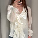 컬렉션 4043/073/712이에요 브이넥 라인부터 아래로 프릴 디테일이 있는 셔츠에요 팔 부분은 벌룬핏으로 디자인되었어요 전체 착용샷이에요 저는 S(KR55) 사이즈를 착용해 보았어요 참고로 저는 평소 S 사이즈를 입어요 해당 제품은 3가지 컬러로 출시되었어요 오늘 소개 드리는 컬러는 크림이에요 프릴...